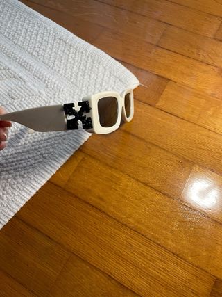 Occhiali da sole con un design moderno e distintivo. - Montatura di colore bianco. - Dettagli a freccia neri sulle aste. - Lenti colorate.