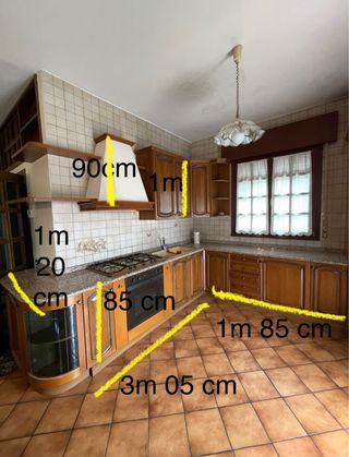 Cucina componibile con finiture in legno e dettagli in vetro. - Mobile base con ante e cassetti. - Pensili con ante. - Piano di lavoro in granito. - Cappa. - Lavello. - Piano cottura. - Forno.