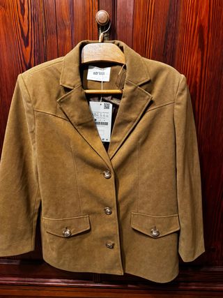 Elegante blazer color beige, perfecto para cualquier ocasión. - Diseño clásico con solapas. - Cierre de un botón. - Dos bolsillos frontales con solapa. - Botones a tono.