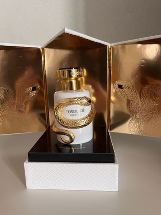 Elegante profumo Roberto Cavalli Serpentine. - Bottiglia in vetro bianco con dettagli dorati. - Design a serpente dorato avvolto attorno alla bottiglia. - Cappuccio dorato con logo inciso.
