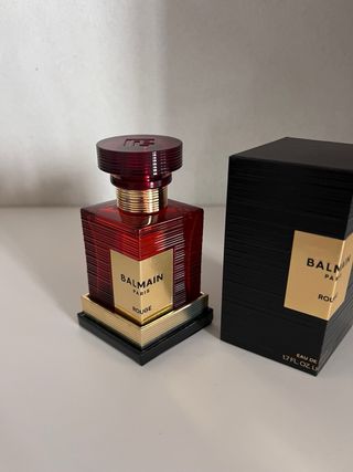 Elegante profumo Balmain Rouge da 50 ml. - Fragranza intensa e sofisticata. - Bottiglia dal design distintivo con dettagli dorati. - Confezione nera con finiture a righe.