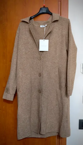 Elegante cappotto in maglia, perfetto per aggiungere un tocco di stile al tuo guardaroba. - Modello con chiusura a bottoni. - Finte Tasche laterali applicate. - Collo a revers.