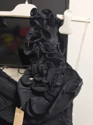 Elegante abito monospalla con Rouge floreale sul busto. La texture a pieghe aggiunge un tocco di raffinatezza. - Design monospalla - Dettaglo rouge decorative - Texture a pieghe su tutta la superficie