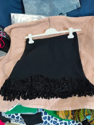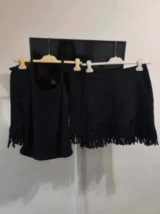 Elegante completo in maglia Rocco Barocco. - Dettagli con frange scintillanti sulle maniche e sul fondo. - Tessuto morbido e confortevole. Indossato solo una volta per un cenone di capodanno.Misure gonna girovita 65cm da fermo, ma è molto elastica, lunghezza 45cm. Top giro seno da fermo 80cm ma anche questo è molto elastico, lunghezza top 38 cm . Manicotti lunghezza 40 cm. Regalo coprispalle NON ROCCO BAROCCO.