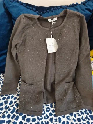 Elegante cardigan Maricla della Valle con un tocco scintillante. Perfetto per aggiungere un dettaglio luminoso al tuo outfit. - Tessuto morbido e confortevole. - Dettagli con brillantini sparsi. - Due tasche frontali applicate. Taglia unica ma calza al massimo una 46 Italiana. Misure: da spalla a spalla 38 cm - giro seno 90 cm - lunghezza 60 cm