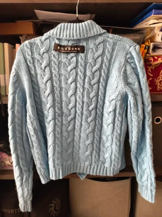 Cardigan con lavorazione a trecce e colletto. - Bottoni frontali. - Maniche lunghe. - Tessuto morbido e caldo. Condizioni pari al nuovo. Misure: da spalla a spalla 45 cm; giro seno 100 cm; lunghezza 58 cm.