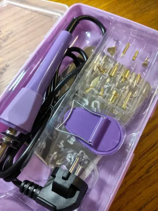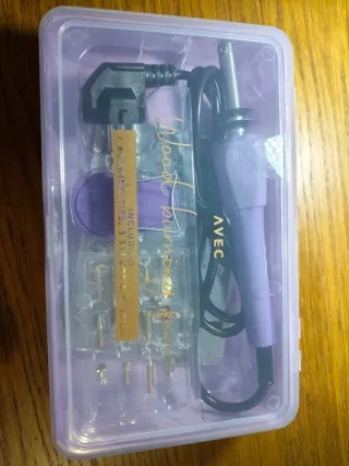 • Oggetto mai usato, aperto solo per dimostrazione in foto. Questo significa che non è mai stato collaudato. Vendo nelle condizioni in cui era sullo scaffale del negozio; • PERICOLO: l'oggetto può raggiungere temperature molto alte e provocare forti ustioni a contatto con carni vive, tenere lontano dalla portata dei bambini; • Colori: viola, oro, argento, lilla, nero, bianco; • Materiali: plastica, metalli vari. Set per pirografia su legno, ideale per chi è alle prime armi. Include tutti gli accessori necessari per iniziare. - Penna per bruciare il legno - Diverse punte per vari effetti - Custodia trasparente per riporre tutto