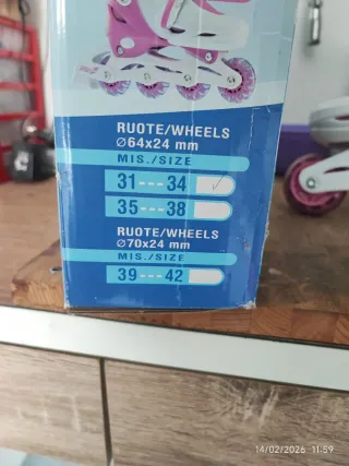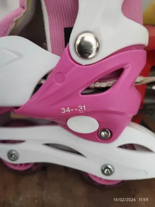 Pattini in linea regolabili per bambina, con un design moderno e accattivante. - Colore principale: rosa e bianco. - Taglia regolabile da 31 a 34. - Chiusura con velcro e fibbia. - Ruote resistenti per un divertimento sicuro.