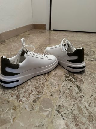 Eleganti scarpe Guess, perfette per completare il tuo look. - Design moderno e pulito. - Dettagli in verde sulla parte posteriore. - Logo Guess visibile sulla linguetta e sul lato. Vendo scarpe Guess NUOVE, provate solo 1 volta e vendo per doppio regalo. Le scarpe sono delle sneakers bianche con il retro in tessuto verde militare. Presentano simbolo Guess girato in una scarpa, ma erano già cosi, eventualmente si può sistemare. Manca la scatola