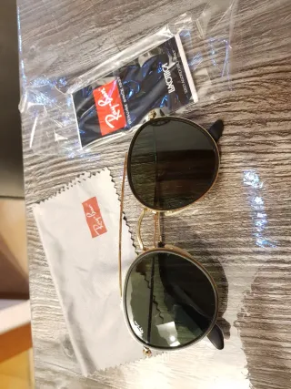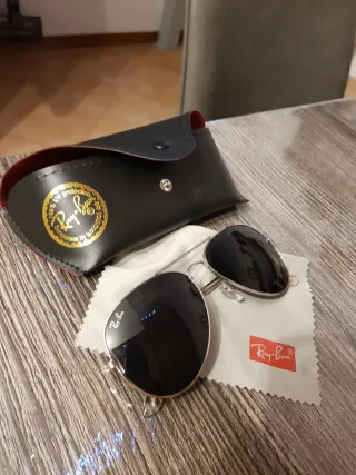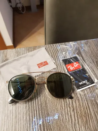 Occhiali da sole Ray-Ban con montatura color oro. Perfetti No segni Originali con tappetino rayban incluso - Lenti verdi. - Modello unisex. - Completi di panno per la pulizia e custodia.