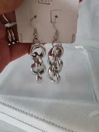 Orecchini pendenti argentati a maglie – LuluBlanc Jewels ✨ Bellissimi orecchini firmati LuluBlanc Jewels, con design moderno e luminoso composto da maglie intrecciate effetto catena in finitura argento lucido 💎 Un accessorio glamour e versatile, perfetto per completare look eleganti o casual chic. 📦 Dettagli: * Marca: LuluBlanc Jewels * Colore: argento lucido ✨ * Materiale: metallo nickel free * Chiusura: gancio ad amo * Lunghezza: circa 6 cm * Condizioni: nuovi, mai indossati 💖 Super leggeri e luminosi, ideali per un tocco sofisticato e di tendenza ✨