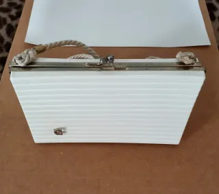 Elegante pochette rigida in stile vintage, perfetta per completare un look. - Design a righe sottili. - Chiusura a scatto metallica. - Cordino intrecciato come manico.