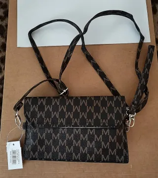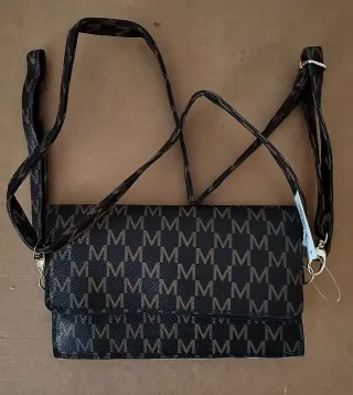 Elegante borsetta portafoglio con tracolla, perfetta per portare con te l'essenziale. - Design con logo M ripetuto. - Tracolla regolabile. - Chiusura a patta.