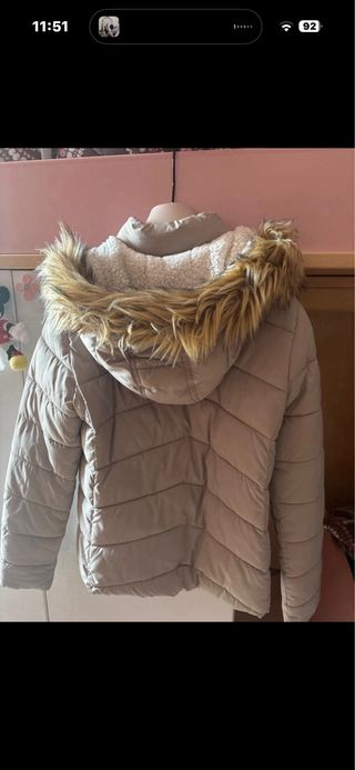 Elegante giubbino da donna. - Cappuccio rimovibile con pelliccia sintetica. - Chiusura con bottoni e zip. - Tasche laterali con zip. - Design trapuntato a chevron.