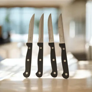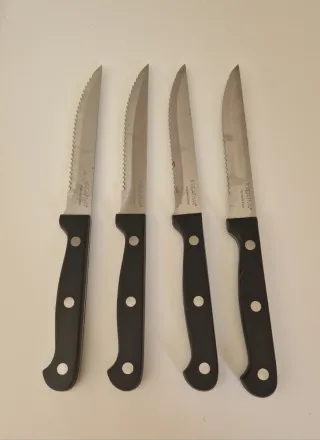 Set di quattro coltelli da carne con lama seghettata. - Manici ergonomici neri. - Lame in metallo resistenti. - Design elegante e funzionale. In ottime condizioni.