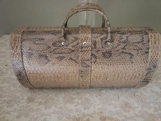 Elegante borsa vintage, ideale per trasportare una bottiglia. Realizzata in pelle con un motivo che imita la pelle di serpente. - Design cilindrico. - Manici superiori. - Chiusura centrale con bottone a pressione.