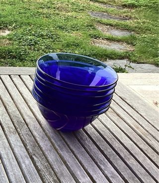 Set di sei ciotole in vetro di un intenso colore blu cobalto. Perfette per servire snack o come elementi decorativi. - Sei ciotole incluse. - Design elegante e moderno.