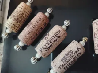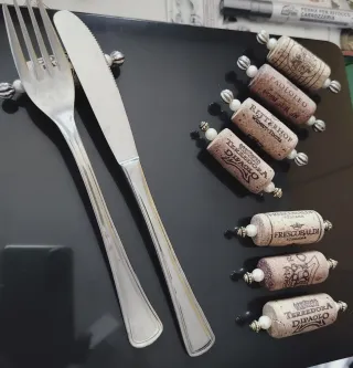 Elegante set di 8 poggia posate realizzati in sughero, perfetti per aggiungere un tocco alla tua tavola. - Decorati con perline e dettagli metallici. - Ogni pezzo presenta un'etichetta di vino diversa, tra cui Paololeo, Ritterhof, Terredora di Paolo e Frescobaldi. - Non esitate a chiedere se ne servono più o meno. - Le posate non sono comprese. - Niente più macchie sulla tovaglia!!