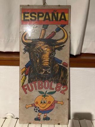 Poster commemorativo del Mundial de Fútbol España 1982. - Diseño con el toro español y la mascota Naranjito. - Representación de la bandera de España. - Motivo de la Copa del Mundo de Fútbol de 1982. 20x60