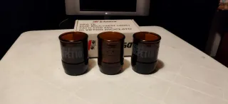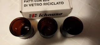 Tre bicchieri Ichnusa dal design unico, realizzati in vetro riciclato. - Bicchieri in vetro ambrato. - Design unico. - nuovi con scatola - prezzo per lotto vendo anche singolarmente