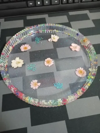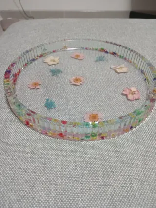 Elegante vassoio rotondo realizzato in resina trasparente, impreziosito da veri fiori secchi colorati . - Fiori secchi perfetta trasparenza e glitter opalescente. - Bordi decorati con glitter e fiori. Diametro 21,5cm