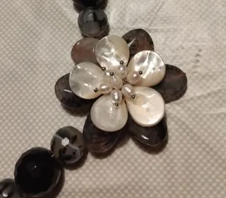 Elegante parure composta da collana e orecchini. - Collana con fiore in madreperla e perline. - Pietre sfaccettate. - Chiusura con strass. - Anni '80 indossata pochissimo. - Orecchini abbinati.