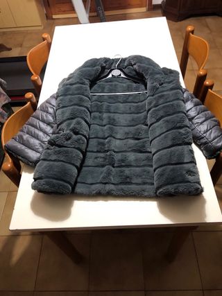 Elegante piumino grigio con un morbido pellicciotto interno che lo rende caldo e confortevole. - Collo alto in pellicciotto. - Chiusura con bottoni a vista. - Maniche a tre quarti. - Fodera interna in pellicciotto.