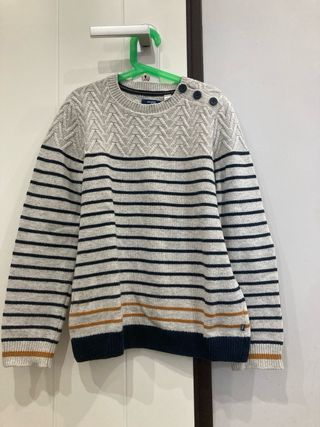 Bellissimo maglione per bambino, perfetto per l'autunno e l'inverno. - Maglia a righe blu e grigio. - Dettagli in maglia intrecciata sulla parte superiore. - Polsini e fondo in maglia a coste. - Chiusura con bottoni sulla spalla. 12anni