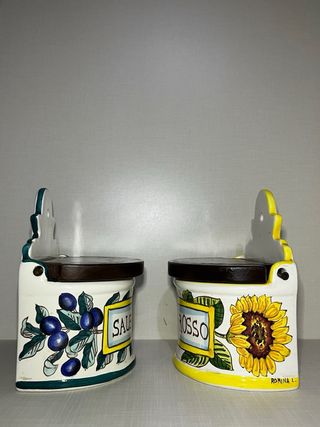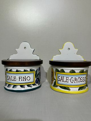 Coppia originale di porta sale da parete in ceramica artistica di Orvieto, dipinti a mano🌿 Completi di coperchio in legno e foro posteriore per appenderli. • Scritte: SALE FINO & SALE GROSSO • Manifattura: Cer. Giacomini - Orvieto (marchio sul fondo) • Stile: rustico, country, cucina italiana, vintage • Condizioni: ottime Perfetti per: -cucina tradizionale -casa di campagna -collezionisti di ceramiche umbre -arredamento vintage 📦Spedizione veloce 📸Foto reali dell'oggetto 🖋️Scrivimi per info o offerte sensate