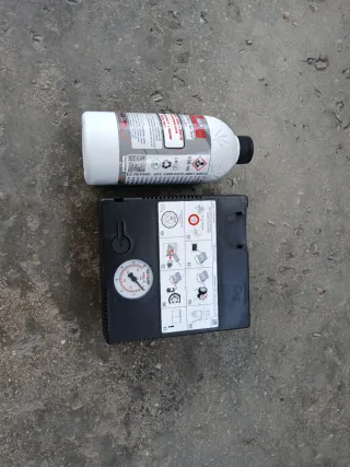 Kit di riparazione per pneumatici, sigillante e compressore. - Liquido sigillante da 500 ml. - Compressore aria con manometro. - Codice prodotto: EZ REPAIR - UFI: 2300-F07C-9001-A9G3. - Marca compressore: aircom.