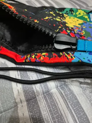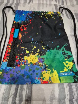 zainetto a sacca Mitama con bellissima grafica a schizzi di colore. Molto robusto rispetto alle solite sacche economiche. Dotato di una particolare maxi-zip laterale nera, una sacca in più. Ideale per la scuola, la palestra o il tempo libero. Condizioni ottime. Dimensioni: Standard Brand: Mitama
