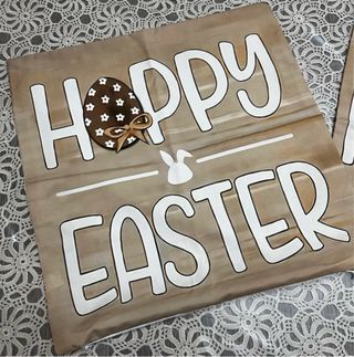 Set di due federe per cuscini con un design a tema pasquale. - Una federa presenta la scritta Hoppy Easter con un uovo decorato. - L'altra federa ha la scritta Hunny Bunny con un coniglietto. - Design stampato su tessuto effetto legno.
