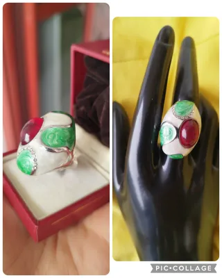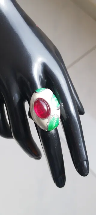 Anello firmato Max Mara con un design unico. Anello gruppo Max Mara da 18 mm. In acciaio argentato. Bombato. Smaltato in colore panna e verde con cabochon rosso centrale adornato da strass. Nuovo. Senza logo.