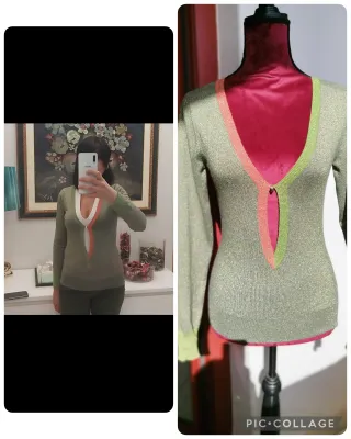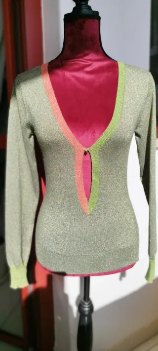 Maglione Phard tg S luminoso con scollatura profonda più colori. Leggero. Primaverile Phard con un design luminoso e una scollatura profonda. Tessuto con fili dorati. Dettagli colorati sulla scollatura. Maniche lunghe. Con elastam. Verde chiaro con scollatura profonda chiusa al centro da un cuoricino. polsi verde e scollo bicolore.
