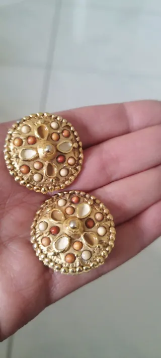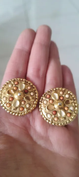 Eleganti orecchini a clip vintage firmati Jacky De G. Design rotondo con decorazioni floreali. - Dettagli in smalto color crema e corallo. - Montatura dorata con finitura lavorata.