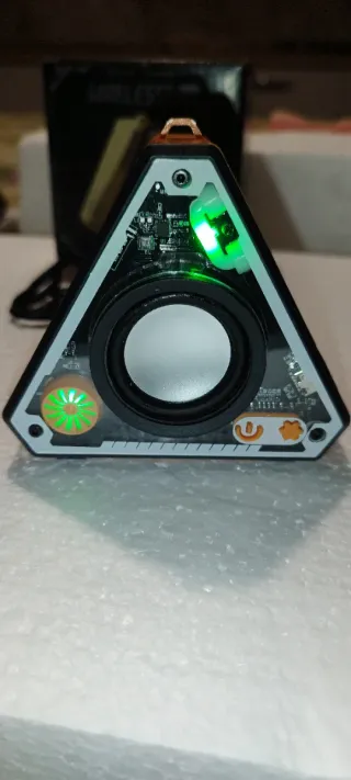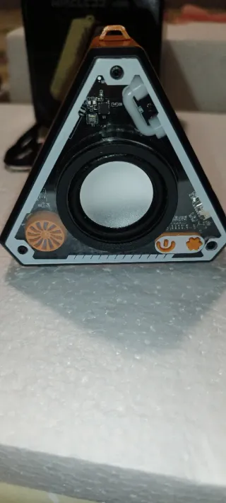 Altoparlante portatile dal design triangolare unico. - Altoparlante centrale. - Dettagli arancioni. - Elementi decorativi a forma di ventola e pulsante. Altoparlante portatile, subwoofer wireless con batteria ricaricabile, amplificatore audio per bassi all'aperto, spiaggia, campeggio, feste, audio compatto per viaggi,