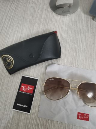 Occhiali da sole Ray-Ban con lenti sfumate. - Montatura color oro. - Lenti marroni sfumate. - Custodia originale inclusa.
