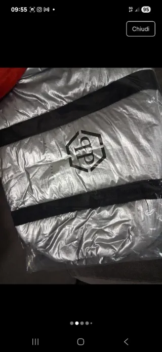 Borsone di lusso Philipp Plein, nuovo e mai usato. Un accessorio elegante e capiente. - Logo esagonale dp sul davanti. - Dettagli a righe nere. - Materiale lucido effetto metallizzato.