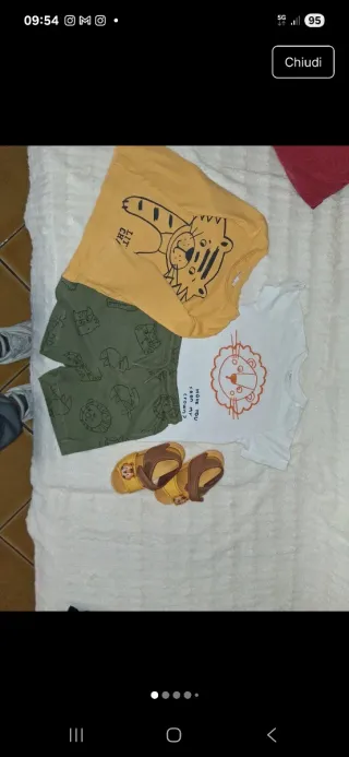 Grazioso completo per bambino composto da maglietta e pantaloncini, ideale per la taglia 2-3 anni. - Maglietta a maniche lunghe gialla con stampa di una tigre. - Pantaloncini verdi con fantasia di animaletti. - Maglietta bianca a maniche corte con stampa di un leone. Taglia sandali 23 (11x23)