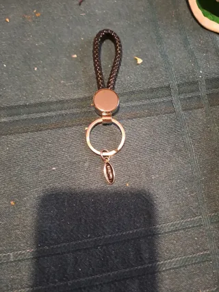 Portachiavi con un design ispirato a una ruota di auto. Il dettaglio della ruota è in metallo dorato, mentre la parte intrecciata è in similpelle grigia. - Design a forma di ruota. - Dettagli in metallo dorato. - Materiale: similpelle intrecciata.