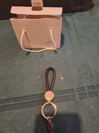 Portachiavi con un design unico e raffinato. - Realizzato in pelle intrecciata marrone. - Dettagli metallici lucidi. - Completo di anello portachiavi.