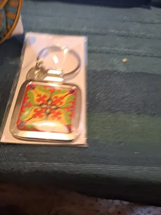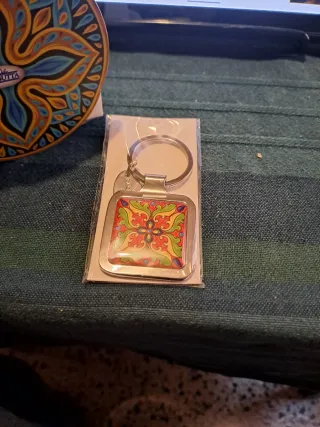 Portachiavi con un design colorato e vivace. - Motivo floreale in stile maiolica. - Cornice metallica argentata.