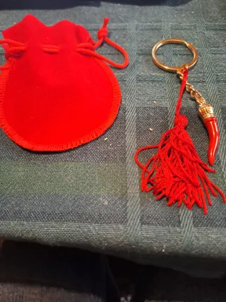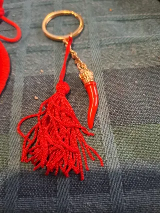 Portachiavi con cornetto rosso portafortuna e nappina. - Anello portachiavi dorato. - Cornetto rosso con corona dorata. - Nappina rossa in tessuto.