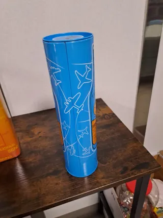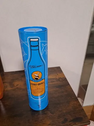 Elegante contenitore cilindrico vuoto del Fernet Branca. - Design blu con illustrazioni bianche. - Etichetta arancione con logo Fernet Branca.