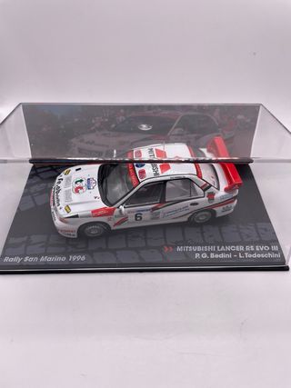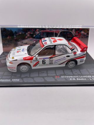 Modellino della Mitsubishi Lancer Evo III che ha partecipato al Rally San Marino nel 1996. - Numero di gara 6 - Equipaggio: P. G. Bedini - L. T. Marino - Sponsor: Mitsubishi, Pirelli, EsmaGlass, Forimpex 15