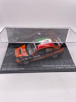 Modellino della Mitsubishi Lancer RS Evo IX, edizione Montecarlo 2011 in scala 1/43. - Dettagli fedeli alla vettura da rally. - Livrea arancione con sponsor. - Base espositiva inclusa. 15