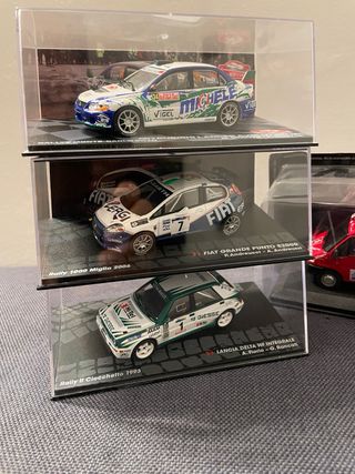 Set di 4 modellini in scala 1:43. - Un modellino di Mitsubishi Lancer Evolution VI. - Un modellino di Fiat Grande Punto S2000. - Un modellino di Lancia Delta Integrale 16V. - Un furgone rosso Citroën con rimorchio.