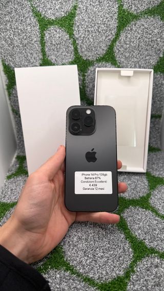 Vendo bellissimo iPhone 14 Pro 128gb Nero completo di scatola e filo. Sono un rivenditore, 12 mesi di garanzia sul buon funzionamento. Il dispositivo è pertettamente funzionante ed originale in ogni sua parte, pronto per essere utilizzato. Non ricondizionato. Funziona con qualsiasi sim fisica e virtuale. Il dispositivo si presenta in ottime condizioni sia dal punto di vista tecnico che estetico. Capacità massima della batteria al 87% Vedete il mio profilo e le mie recensioni, massima serieta! Vi prego di evitare offerte ridicole perché saranno subito cestinate, grazie. Per info non esitate a contattarmi!