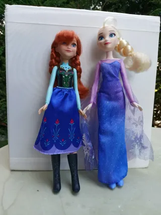 Set di bambole delle principesse Disney Anna ed Elsa dal film Frozen. - Bambola di Anna con abito blu e stivali neri. - Bambola di Elsa con abito viola scintillante e mantello. - Prodotto Hasbro.