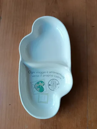 Elegante porta stuzzichini a due scomparti, perfetto per servire snack o antipasti. - Design a forma di cuore. - Decorato con timbri e una mappa del mondo stilizzata. - Scritta Ogni viaggio è una avventura verso il proprio cuore... Dimensioni 19,3x10x3
